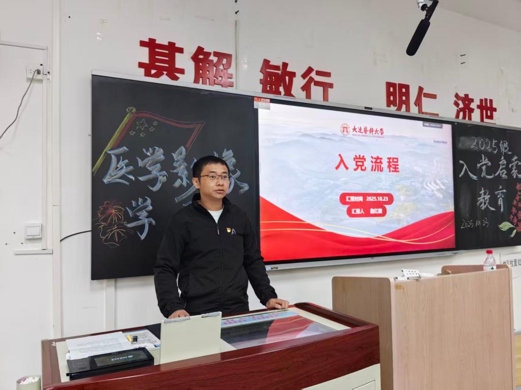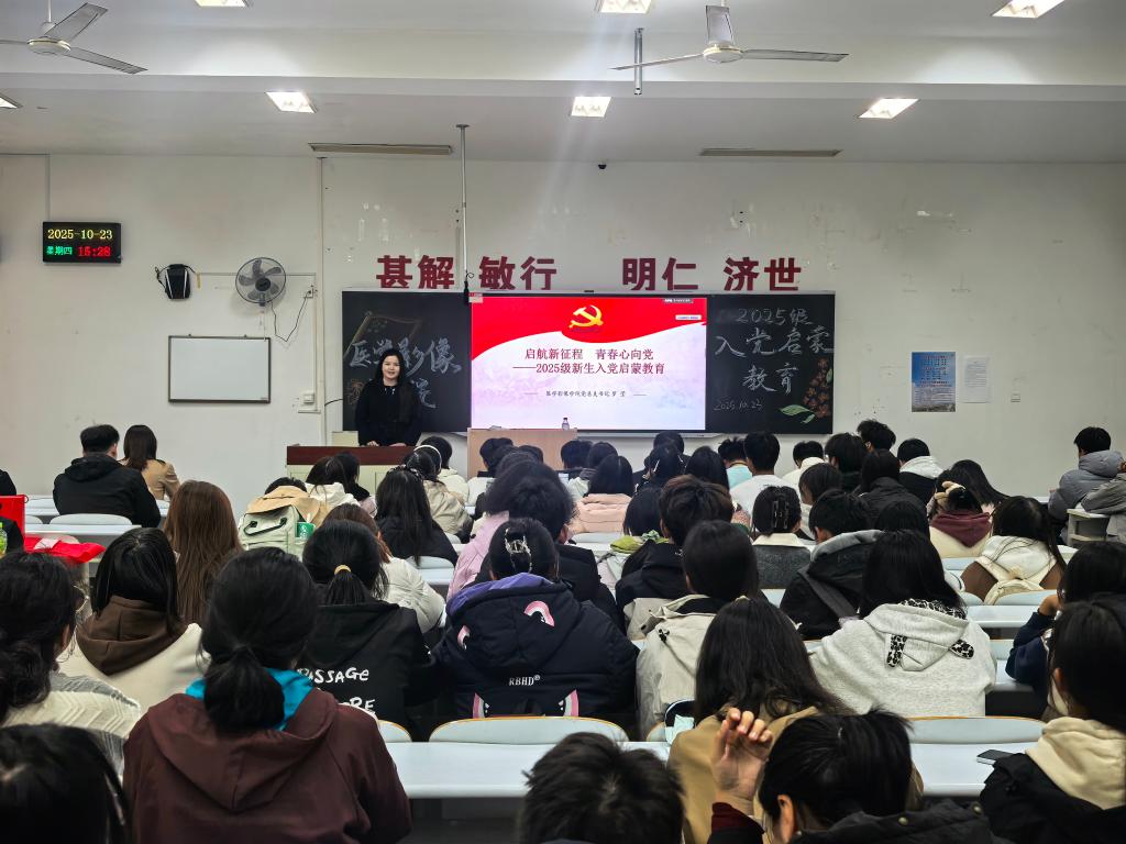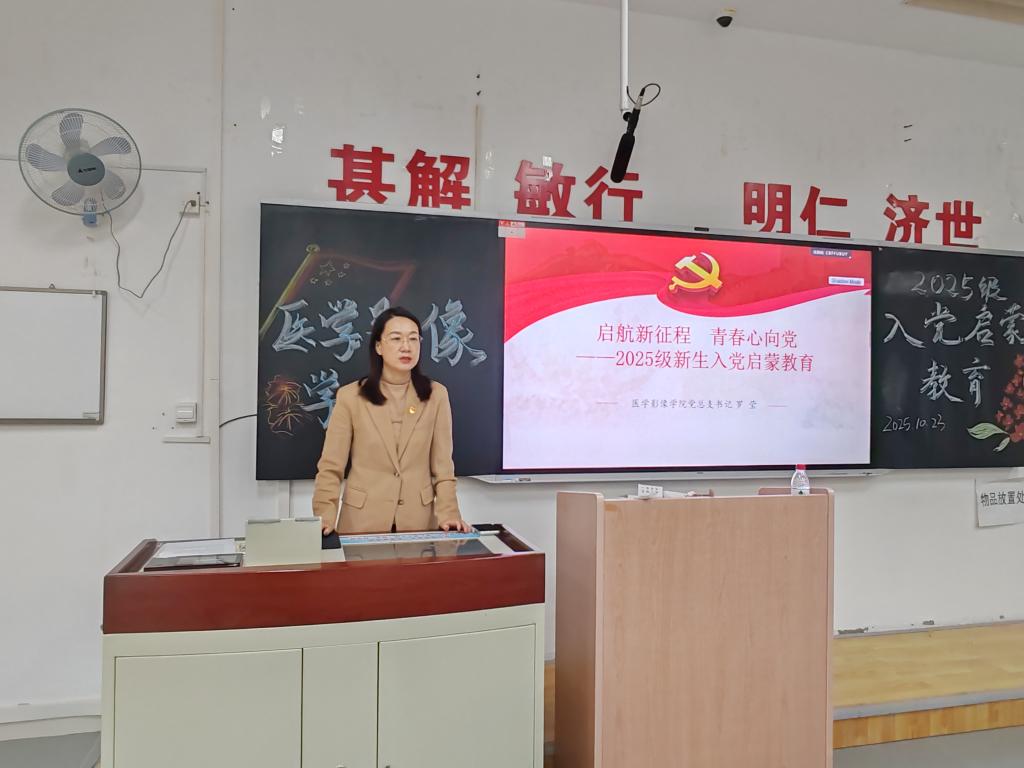 为切实加强新生思想政治引领,引导新生深入学习中国共产党的初心使命与历史担当,端正入党动机,扣好大学“思想成长第一粒扣子”,10月23日下午,医学影像学院党总支在D108教室举行以“启航新征程 青春心向党”为主题的新生入党启蒙教育。学院党总支书记罗莹作“中国共产党的奋斗历程与校史校情”专题讲解,学院组织员詹红微介绍发展党员工作流程,学院学生工作办公室副主任聂浩然、2025 级全体本科生及硕士生参加会议。会议由研究生辅导员花映天主持。