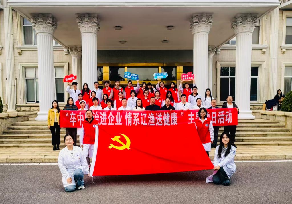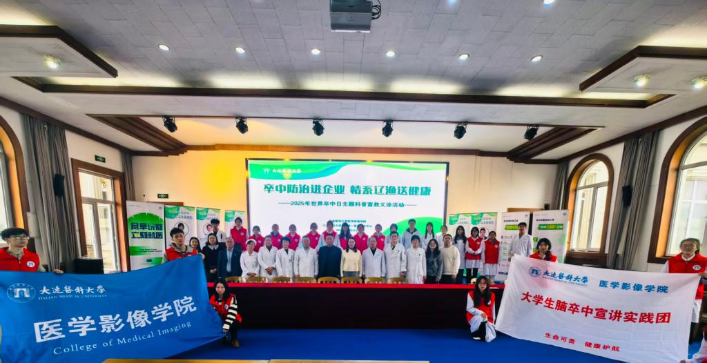 在第20个“世界卒中日”来临之际,为积极响应“健康中国”战略部署,切实守护企业职工身心健康,10月28日中午,医学影像学院携手附属第一医院卒中中心,到辽渔集团开展“卒中防治进企业,情系辽渔送健康”主题公益活动。辽渔集团党委副书记、董事、工会主席王利民、纪委副书记宋恩贤,大连医科大学医学影像学院党总支书记罗莹、副院长孙闯、附属第一医院卒中中心常务副主任、介入治疗科主任王峰教授团队以及医学影像学院党员教师、大学生脑卒中宣讲实践团成员和学生党员、积极分子50余人参加活动。