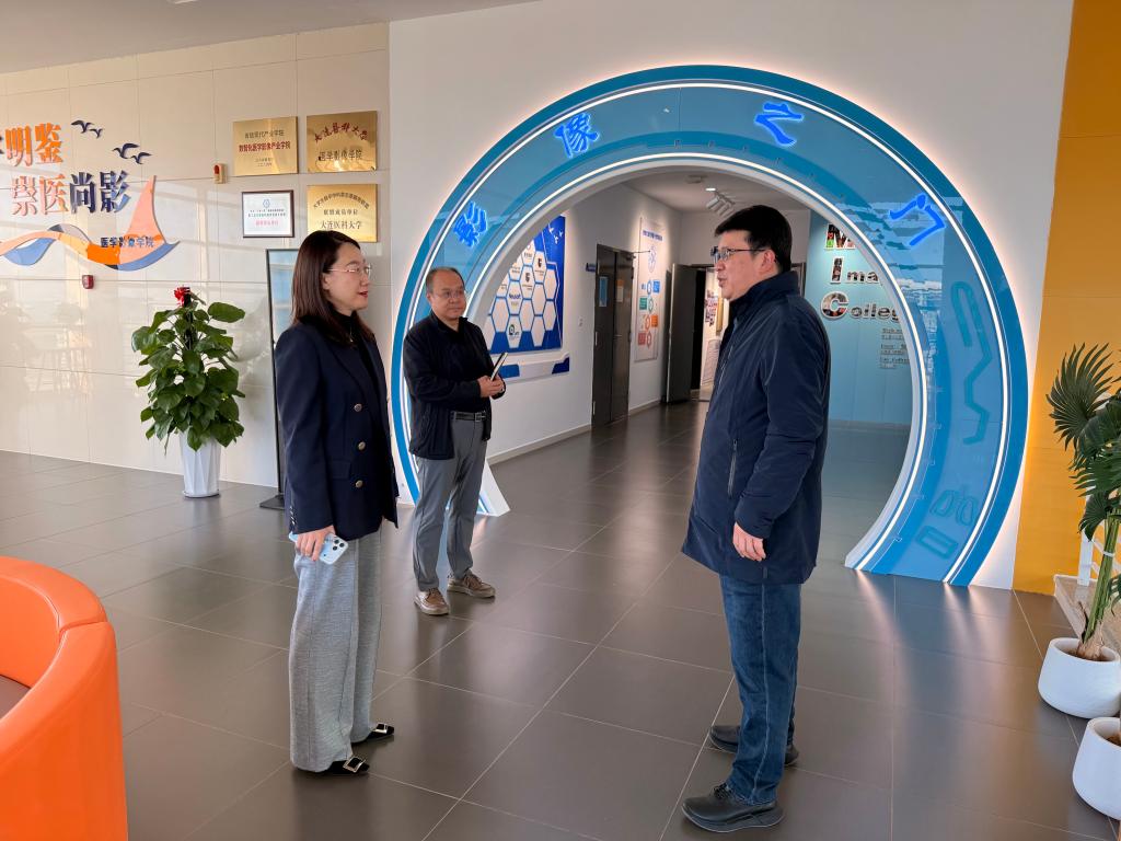 刘志宇首先参观了学院楼宇文化,医学影像学院党总支书记罗莹对“影像之门”、“影像之家”、学院英文文化墙、数智化医学影像产业文化墙等楼宇文化进行了介绍。